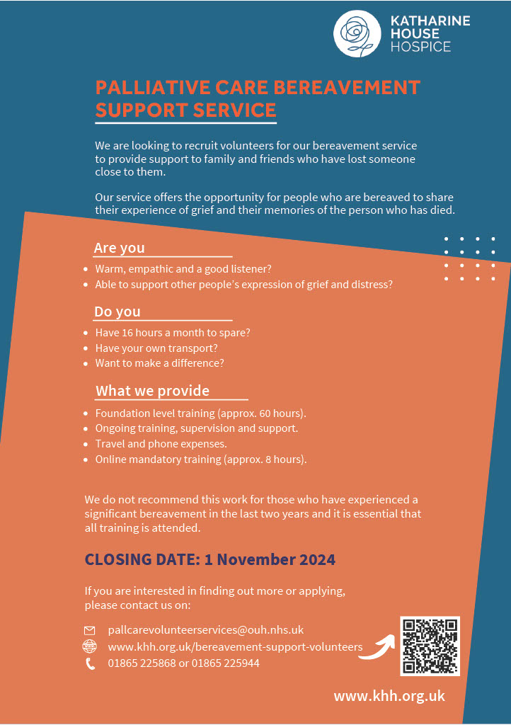 Please see below a poster from Katherine House Hospice looking for volunteers to support their palliative care services.